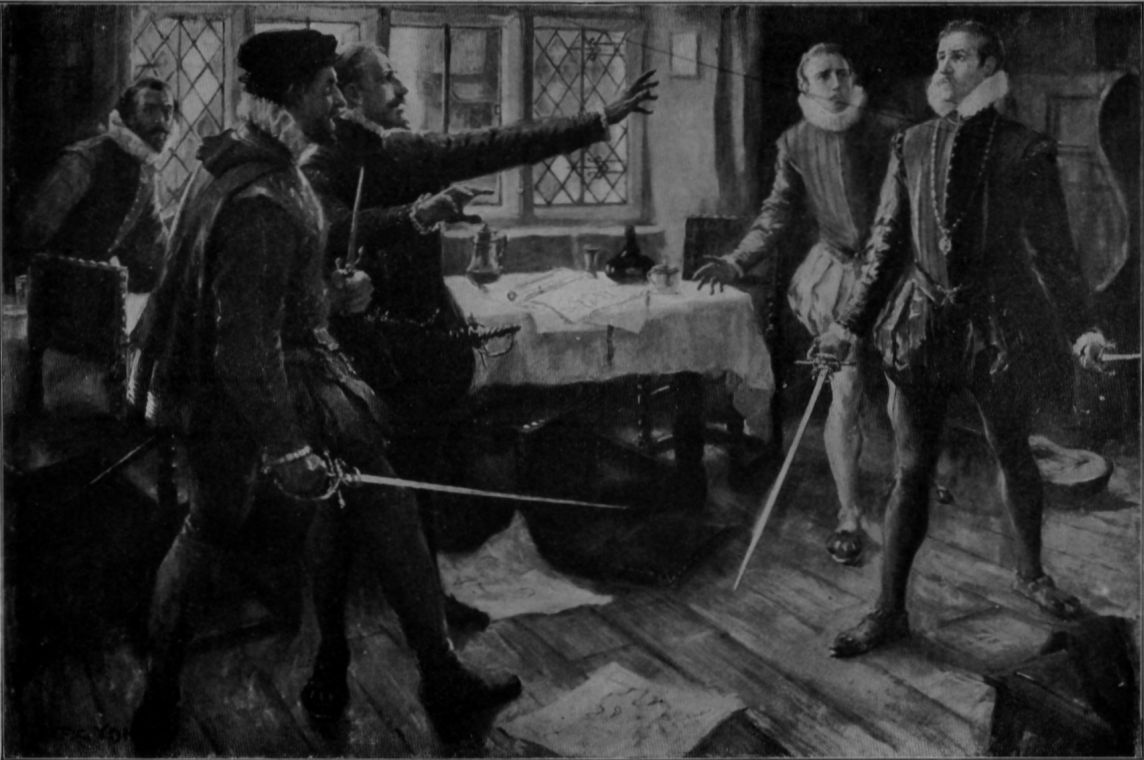The three witnesses of the challenge sprang to their feet, the gittern falling from Sedley's hands, and Sir John's papers fluttering to the floor. The latter thrust himself between the two who had bared their weapons. "What is this, gentlemen? Mortimer Ferne, put up your sword! Captain Baldry, your valor may keep for the Spaniards! Obey me, sirs!"