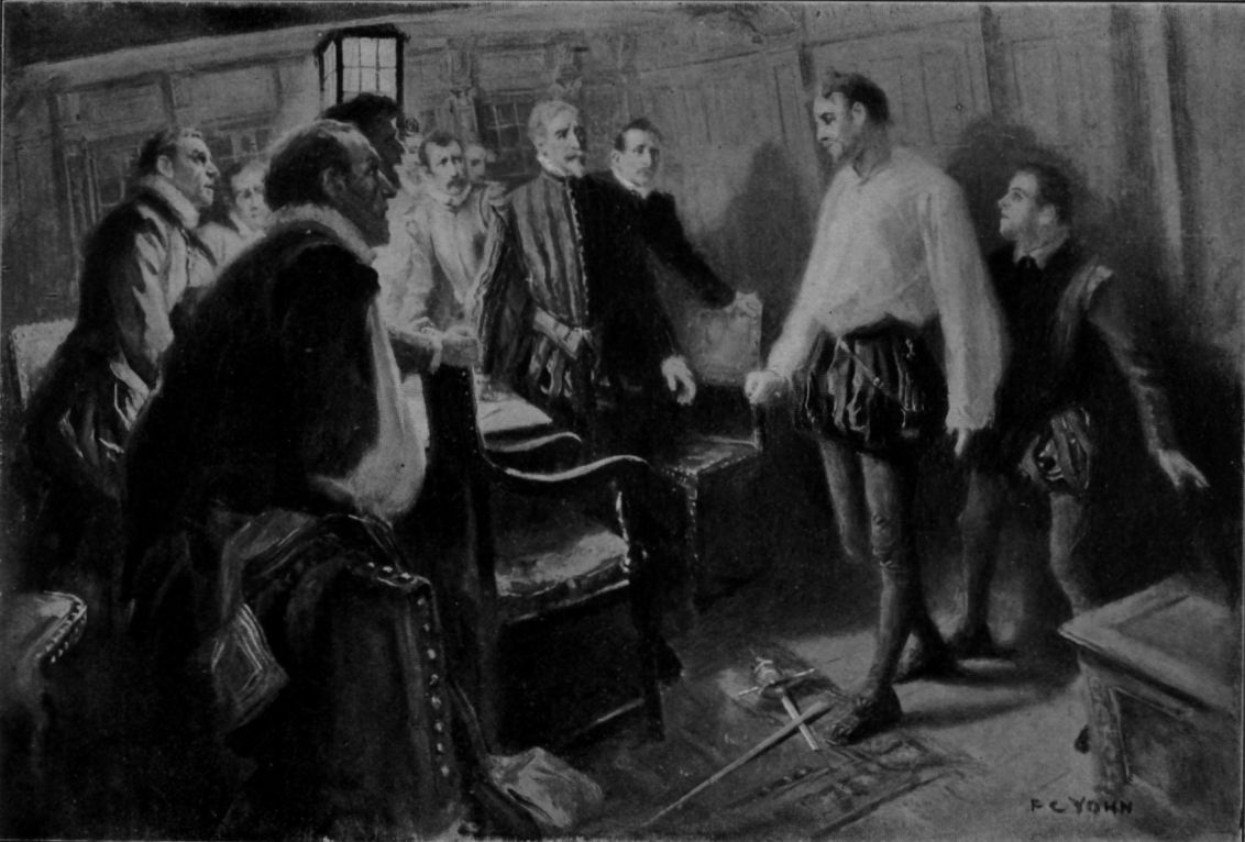 "My servant to-day, sir," thundered the Admiral, "in that I will force you to leave this quarrel! Death of my life! shall this get abroad? Not that common soldiers or mariners ashore fall out and cudgel each other until the one cannot handle a rope nor the other a morris-pike! not that wild gallants, reckless and broken adventurers whose loss the next daredevil scamp may supply, choose the eve of sailing for a duello, in which one or both may be slain; but that strive together my captains, men vowed to noble service, loyal aid, whose names are in all mouths, who go forth upon this adventure not (I trust in God) with an eye single to the gain of the purse, but thinking, rather, to pluck green laurels for themselves, and to bring to the Queen and England gifts of waning danger, waxing power! What reproach--what evil augury--nay, perhaps, what maiming of our enterprise! Leaders and commanders that you are, with your goodly ships, your mariners and soldiers awaiting you, and above us all the lode-star of noblest duty, truest honor--will you thus prefer to the common good your private quarrel? Nay, now, I might say 'you shall not'; but, instead, I choose to think you will not!"