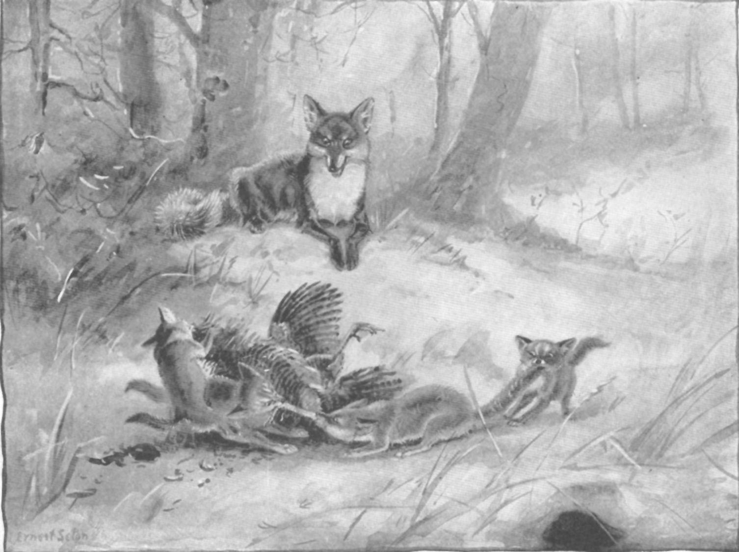 Back to the den came Vix, and carried the chuck so carefully that he was able to struggle a little when she got there. A low 'woof' at the den brought the little fellows out like school-boys to play. She threw the wounded animal to them and they set on him like four little furies, uttering little growls and biting little bites with all the strength of their baby jaws, but the woodchuck fought for his life and beating them off slowly hobbled to the shelter of a thicket. The little ones pursued like a pack of hounds and dragged at his tail and flanks, but could not hold him back. So Vix overtook him with a couple of bounds and dragged him again into the open for the children to worry. Again and again this rough sport went on till one of the little ones was badly bitten, and his squeal of pain roused Vix to end the woodchuck's misery and serve him up at once.