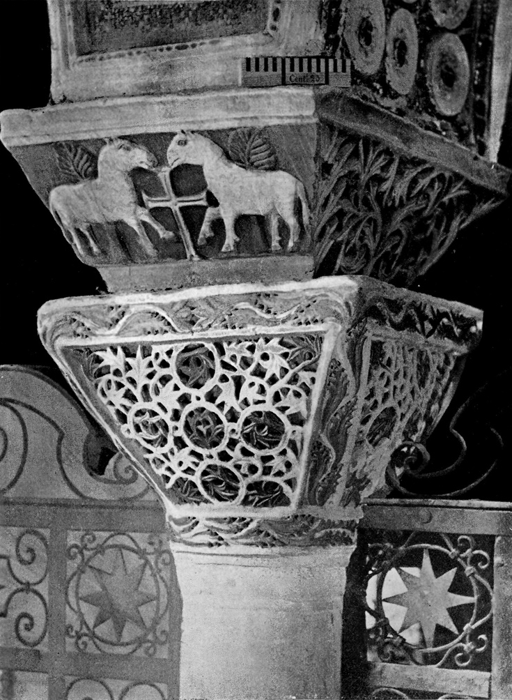 This is one of the most beautiful and most characteristic capitals of the Byzantine style. Its form and decoration are both typical of the style. The flat treatment of the interlace of the vine motive is very generally used, and can be seen in great variety in S. Vitale and elsewhere. The ornament is here enriched with gold and color. In the double capitals of Ravenna the upper member, or cushion, is usually ornamented with symbolic designs drawn from various sources, both Pagan and Christian.