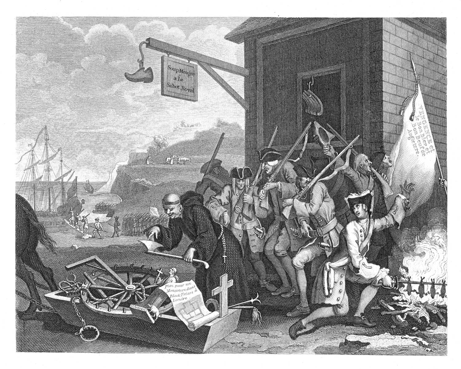 The scenes of all Mr. Hogarth's prints, except The Gate of Calais, and that now under consideration, are laid in England. In this, having quitted his own country, he seems to think himself out of the reach of the critics, and, in delineating a Frenchman, at liberty to depart from nature, and sport in the fairy regions of caricature. Were[Pg 114] these Gallic soldiers naked, each of them would appear like a forked radish, with a head fantastically carved upon it with a knife: so forlorn! that to any thick sight he would be invisible. To see this miserable woe-begone refuse of the army, who look like a group detached from the main body and put on the sick list, embarking to conquer a neighbouring kingdom, is ridiculous enough, and at the time of publication must have had great effect. The artist seemed sensible that it was necessary to account for the unsubstantial appearance of these shadows of men, and has hinted at their want of solid food, in the bare bones of beef hung up in the window, the inscription on the alehouse sign, "Soup maigre au Sabot Royal," and the spider-like officer roasting four frogs which he has impaled upon his sword. Such light and airy diet is whimsically opposed by the motto on the standard, which two of the most valorous of this ghastly troop are hailing with grim delight and loud exultation. It is, indeed, an attractive motto, and well calculated to inspire this famishing company with courage:—"Vengeance, avec la bonne Bière, et bon bœuf d'Angleterre." However meagre the military, the church militant is in no danger of starving. The portly friar is neither emaciated by fasting nor weakened by penance. Anticipating the glory of extirpating heresy, he is feeling the sharp edge of an axe, to be employed in the decollation of the enemies to the true faith. A sledge is laden with whips, wheels, ropes, chains, gibbets, and other inquisitorial engines of torture, which are admirably calculated for the propagation of a religion that was established in meekness and mercy, and inculcates universal charity and forbearance. On the same sledge is an image of St. Anthony, accompanied by his pig, and the plan of a monastery to be built at Black Friars.