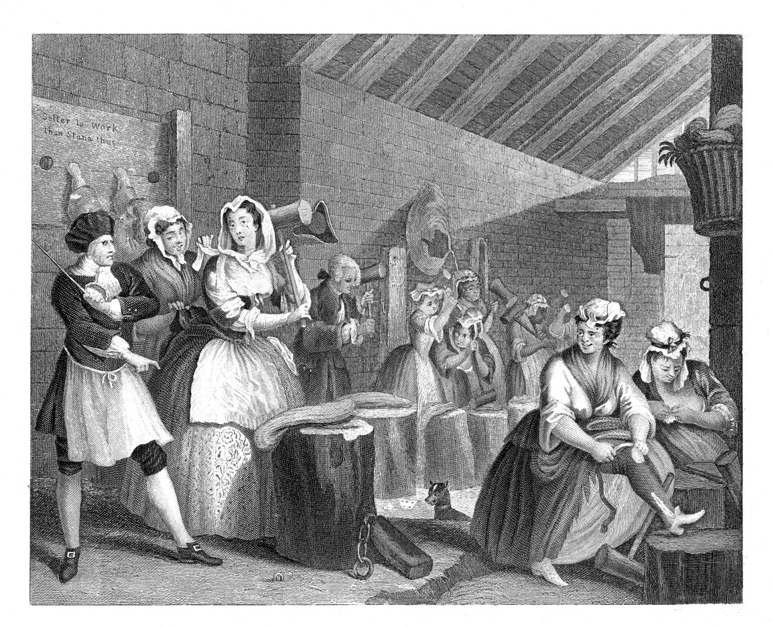 The first print presents us with a noble and striking contrast in two apprentices at the looms of their master, a silk-weaver of Spitalfields: in the one we observe a serene[Pg 86] and open countenance, the distinguishing mark of innocence; and in the other a sullen, down-cast look, the index of a corrupt mind and vicious heart. The industrious youth is diligently employed at his work, and his thoughts taken up with the business he is upon. His book, called the "'Prentice's Guide," supposed to be given him for instruction, lies open beside him, as if perused with care and attention. The employment of the day seems his constant study; and the interest of his master his continual regard. We are given to understand, also, by the ballads of the London 'Prentice, Whittingham the Mayor, &c. that hang behind him, that he lays out his pence on things that may improve his mind, and enlighten his understanding. On the contrary, his fellow-'prentice, with worn-out coat and uncombed hair, overpowered with beer, indicated by the half-gallon pot before him, is fallen asleep; and from the shuttle becoming the plaything of the wanton kitten, we learn how he slumbers on, inattentive alike to his own and his master's interest. The ballad of Moll Flanders, on the wall behind him, shows that the bent of his mind is towards that which is bad; and his book of instructions lying torn and defaced upon the ground, manifests how regardless he is of any thing tending to his future welfare.