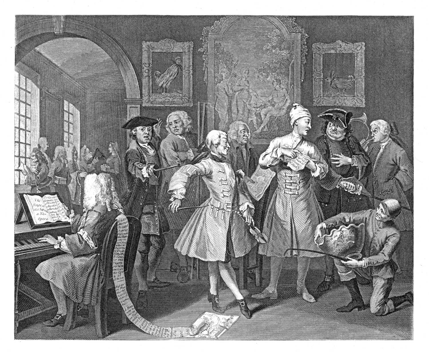 The avarice of the penurious father then, in this print, is contrasted by the giddy profusion of his prodigal son. We view him now at his levee, attended by masters of various professions, supposed to be here offering their interested services. The foremost figure is readily known to be a dancing-master; behind him are two men, who at the time when these prints were first published, were noted for teaching the arts of defence by different weapons, and who are here drawn from the life; one of whom is a Frenchman, teacher of the small-sword, making a thrust with his foil; the other an Englishman, master of the quarter-staff; the vivacity of the first, and the cold contempt visible in the face of the second, beautifully describe the natural disposition of the two nations. On the left of the latter stands an improver of gardens, drawn also from the life, offering a plan for that purpose. A taste for gardening, carried to excess, must be acknowledged to have been the ruin of numbers, it being a passion that is seldom, if ever, satisfied, and attended with the greatest expense. In the chair sits a professor of music, at the harpsichord, running over the keys, waiting to give his pupil a lesson; behind whose chair hangs a list of the presents, one Farinelli, an Italian singer, received the next day after his first performance at the Opera House; amongst which, there is notice taken of one, which he received from the hero of our piece, thus: "A gold snuff-box, chased, with the story of Orpheus charming the brutes, by J. Rakewell, esq." By these mementos of extravagance and pride, (for gifts of this kind proceed oftener from ostentation than generosity,) and by the engraved frontispiece to a poem, dedicated to our fashionable spendthrift, lying on the floor, which represents the ladies of Britain sacrificing their hearts to the idol Farinelli, crying out, with the greatest earnestness, "one G—d, one Farinelli," we are given to understand the prevailing dissipation and luxury of the times. Near the principal figure in this plate is that of him, with one hand on his breast, the other on his sword, whom we may easily discover to be a bravo; he is represented as having brought a letter of recommendation, as one disposed to under[Pg 14]take all sorts of service. This character is rather Italian than English; but is here introduced to fill up the list of persons at that time too often engaged in the service of the votaries of extravagance and fashion. Our author would have it imagined in the interval between the first scene and this, that the young man whose history he is painting, had now given himself up to every fashionable extravagance; and among others, he had imbibed a taste for cock-fighting and horse-racing; two amusements, which, at that time, the man of fashion could not dispense with. This is evident, from his rider bringing in a silver punch-bowl, which one of his horses is supposed to have won, and his saloon being ridiculously ornamented with the portraits of celebrated cocks. The figures in the back part of this plate represent tailors, peruke-makers, milliners, and such other persons as generally fill the antichamber of a man of quality, except one, who is supposed to be a poet, and has written some panegyric on the person whose levee he attends, and who waits for that approbation he already vainly anticipates. Upon the whole, the general tenor of this scene is to teach us, that the man of fashion is too often exposed to the rapacity of his fellow creatures, and is commonly a dupe to the more knowing part of the world.