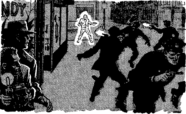 The noise was louder, and the flashes in the sky brighter—it looked as though they were moving this way. Well, I didn't have any money tied up in the car, so I wasn't worried about leaving it in the street. And somebody's cellar seemed like a very good place to be. I called the office and started to tell Harrison what we'd found out; but he stopped me short. "Sandy, where've you been? I've been trying to call you for—Listen, we got a call from Fordham. They've detected radiation coming from the East Side—it's got to be what's going on up there! Radiation, do you hear me? That means atomic weapons! Now, you get th—"