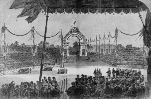 On the following day the Indian troops sent from the great Eastern realm to honour the Coronation of its Emperor were reviewed at the same place. His Majesty wore a jewelled sword which cost some $50,000, and had been presented to him on the previous day by the Maharajah of Jaipur. The scene was a most brilliant and picturesque one. The British notables present wore military or Levée dress; the great lawn of the Palace was a splendid spectacle in red, yellow, green and blue; the Eastern Princes were gorgeous in jewels and many-coloured raiment, and the little Princes Edward and Albert of Wales constituted themselves Aides of the King and brought several general officers up to have an audience. After the march past and the distribution of medals at the hands of the Prince of Wales, His Majesty addressed the troops in the following words: "I wish to convey to all ranks the high satisfaction it has given me to see this splendid contingent from India. I almost feared, owing to my serious illness, that I[Pg 418] would be prevented from having the advantage of seeing you, but I am glad to say that by God's mercy I am well again. I recognize among you many of the regiments I had the advantage of seeing at Delhi during my tour of India." During the next few days various minor functions took place, and the Colonial leaders especially were feasted and entertained in every possible way.