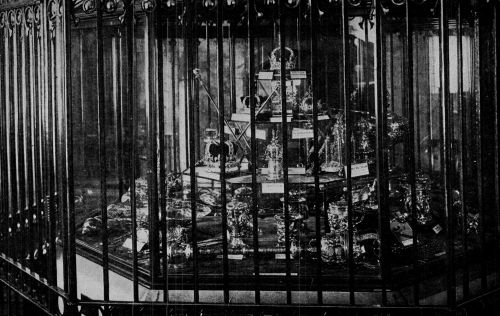 Preceded by the booming of minute guns, the slow pealing of bells and the roll of muffled drums the procession passed to its destination. It included the Headquarters Staff of the Army with Lord Roberts leading, the Admiralty Board, the great officers of Army and Navy, dismounted troops, Indian officers. These preceded the plain gun-carriage on which rested the Royal remains, the coffin covered with a white satin pall and the Royal Standard, on which rested the Crown, the Orb and the Sceptre. Drawn by eight magnificent black horses and flanked by the King's Company of the Royal Grenadiers the bier was followed by King George on foot with his two eldest sons and behind them were the Kings of Denmark and Norway, the Duke of Connaught, various visiting royalties, or representatives, and the household of the late King. A mounted escort succeeded and then came a carriage containing the Queen-Mother, her sister the Dowager Empress of Russia, the Princess Royal and Princess Victoria, another with Queen Mary, and others with the Queen of Norway and various members of the royal family. Last of all came a body of mounted troops. All along the route, which was scarcely half a mile in length, the attitude of the uncounted multitude was one of deep personal grief. No word was spoken and after heads had been uncovered, the masses of people were described as looking like an assembly of graven images. At the noble Hall, famous in British history for more than 800 years, the Archbishop of Canterbury and the Duke of Norfolk received the coffin and preceded it to the catafalque. No attempt at funeral [Pg 453]decoration marred the noble simplicity of the grand interior. The spacious floor was laid with dull grey felt. In the centre, on a slightly elevated dais spread with a purple carpet stood the lofty purple draped catafalque. No flowing draperies softened its outlines and it appeared like smoothly chiselled blocks of purple granite.