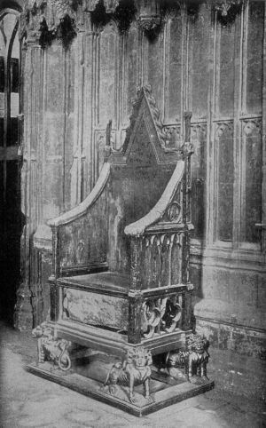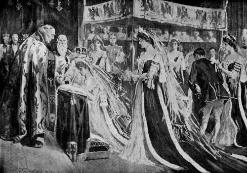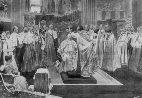 There were several incidents in connection with the Coronation ceremonies which deeply impressed the onlookers. One was the spontaneous and obvious sincerity of the King's affectionate greeting to his son. Another was the enfeebled condition of the aged Archbishop of Canterbury. With his massive frame, brilliant intellect, and piercing eyes Dr. Temple had lived a life of intense mental activity and religious zeal, but in these declining days the massive form had become bent and trembling, the memory and the eyes found difficulties in the solemn words of the service, and his shaking hands could hardly place the Crown upon the head of his[Pg 415] King. But the latter's solicitude and anxious care to save the Primate any exertion, not absolutely essential, were marked and noticed by all that vast assemblage. The Royal patient was transformed, by kindly sympathy, into a guardian of the Archbishop's weakness. When tendering his homage as first of all the subjects of the King, the aged Primate almost fainted and was unable to rise from his knees until His Majesty assisted him. Prior to the actual Coronation, Mr. Edwin A. Abbey, R.A., who had been commissioned by the King to paint a picture of the historic scene, was allowed to take note of the surroundings. Another incident of the event was the presence of the Duchess of Mecklenburg-Strelitz—placed by desire of Queen Alexandra in a seat at the exact spot which she had held during the Coronation of Queen Victoria.