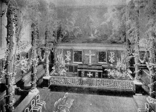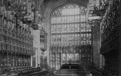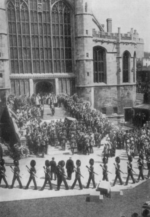 The train to Windsor contained a funeral car upholstered in purple and white silk with a catafalque on which the casket was placed and around it were grouped the near members of the Royal Family and eight Sovereigns of Foreign States. From Windsor station to the Castle the procession formed in the previous order except that the Royal mourners walked while sailors drew the gun-carriage to the famous home of Britain's monarchs and to the entrance of the historic St. George's Chapel. Here, where King Edward was christened and married and shared in so many stately functions, the final religious ceremonies were performed by the Archbishops of Canterbury and York. While the coffin rested on a purple catafalque before the altar, which was almost buried in floral emblems, and minute guns boomed and bells tolled, the briefest service of the Church of England—at Queen Alexandra's request—was proceeded with and the body slowly, reverently, lowered into the vault. A prayer was then uttered for the new King and the Benediction pronounced by the Archbishop of Canterbury.