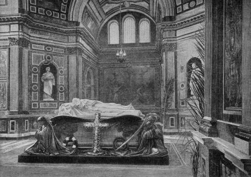 Following these events Westminster Hall for two days was thrown open to the public and a continuous procession of half a million mourners passed the coffin and looked for the last time upon the face of their well-loved Sovereign. Into Windsor, meanwhile, there poured innumerable evidences of the peoples' sympathy from the costliest tribute of wealth and aristocracy to the thousands of simple green wreaths sent in by the poorer classes. To Westminster Hall, on May 19th, the Emperor William of Germany, soon after his arrival, proceeded with King George, stood for a while in the private enclosure as the countless stream of people passed slowly by, then descended to the floor of the Hall—the Kaiser carrying a wreath of purple and white flowers—and together knelt within the rails while the stream of passers-by was temporarily suspended. When the two monarchs arose the Emperor William held out his hand which King George clasped and held for some moments.