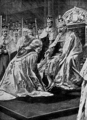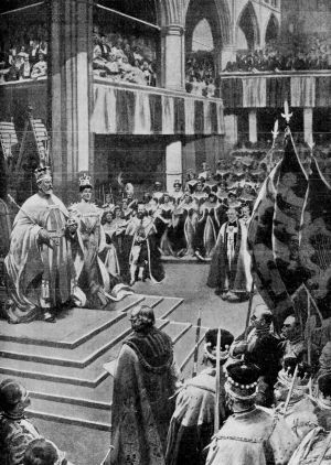 The King and Queen then passed to the Altar together, taking off their Crowns and kneeling on faldstools and His Majesty formally offered the Sacrament of Communion to the Archbishop. After thus indicating his headship of the National Church, the King returned with his Consort to their chairs and listened to some brief prayers. Thence they returned to the Altar, received Communion from the Archbishop of Canterbury and then passed into the Chapel of Edward the Confessor accompanied by a stately procession. There they were arrayed in Royal robes of purple and velvet, in place of the mantels previously worn, and passed with slow and stately dignity down the nave, out to their carriage and thence through masses of cheering people to Buckingham Palace.