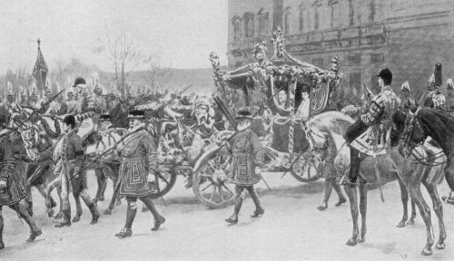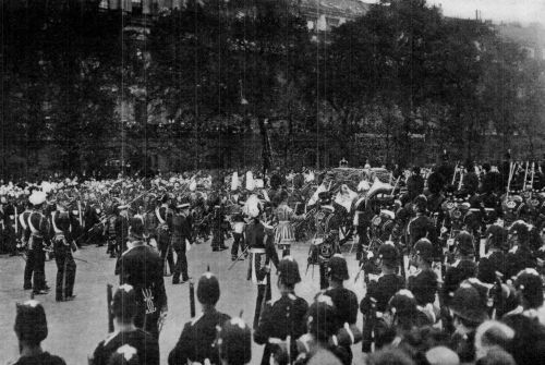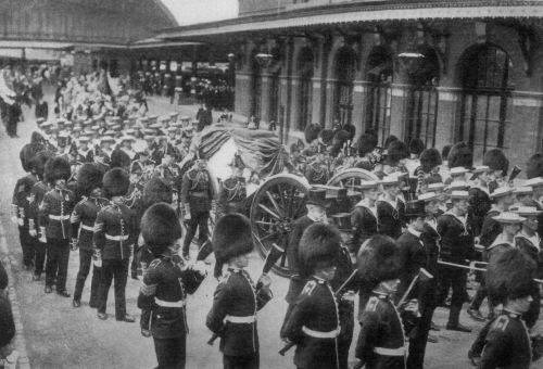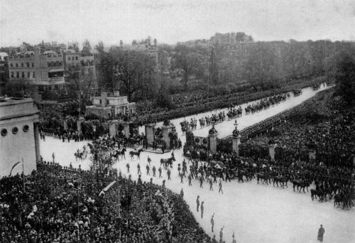 By May 20th the preparations were all in readiness for the final functions and splendid ceremonial. The streets were draped from Buckingham Palace to Westminster Hall, and thence to Paddington Station, in great masses of purple and white and black; Venetian masts lined the route on which hung masses of funeral wreaths from the people; half-masted flags were everywhere. The town of Windsor was almost buried from sight in the purple trappings of grief and royalty. On the day itself solemn, silent multitudes of men and women, estimated at from three to five millions, were massed along the route of the procession with 35,000 soldiers lining the streets and a parade which even London had never equalled for mingled splendour and solemnity. At 9:10 a. m., the deep-toned bell[Pg 456] of Westminster announced the beginning of the royal obsequies. King George, Queen Mary, the Queen Mother, the royal family and the visiting monarchs and representatives of the powers and the Empire, left Buckingham Palace and proceeded with a small escort to Westminster Hall amidst the tolling of bells and the firing of minute guns. Only Queen Alexandra, the Princess Victoria, the King and the Emperor William entered the Hall and saw the body removed from the catafalque to the gun-carriage outside where it rested under conditions similar to those of the earlier removal from Buckingham Palace. Outside, the Queen Mother entered her coach and, as the body-guard of Kings wheeled around and passed her carriage, three by three, each saluted her with silent reverence.