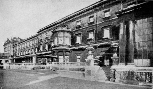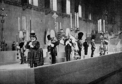 At home in London the casket to contain the Royal remains was fashioned of British oak from the Forest of Windsor and on May 14th, the body of King Edward was removed from the room in which he died to the Throne Room of Buckingham Palace, and there placed on a catafalque in front of a temporary altar where it was guarded night and day by four Royal Grenadiers. On May 16th, amidst a solemn and imposing but preliminary pageant the late King was carried from the[Pg 452] Palace where he died to Westminster Hall, where the remains were to lie in solemn state. A farewell family service had been held by the Bishop of London and then the body at 11.30 in the morning was transported to its new resting-place between double lines of red-coated soldiers, flanked by dense and silent masses of mourning people, with buildings on every hand heavily draped.