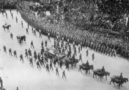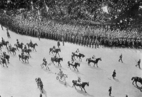 The procession left Westminster at 9.30 headed by a long column of troops and bluejackets and the greater officers of the Army and Navy. Bands of the Household cavalry, the new Territorial troops, Colonial soldiers, were first and then came various volunteer corps, the Honourable Artillery Company, officers of the Indian regiments in their picturesque uniforms and turbans, followed by detachments of infantry, Foot Guards, Royal Engineers, Garrison, Field and Horse Artillery. Naval representatives came next with the military attaches of the foreign embassies, the officers of the Headquarters Staff of the Army and the Field Marshals and massed bands playing solemn funeral marches. Then followed the chief officers of State, followed by the Duke of Norfolk and succeeded by a single soldier carrying the Royal Standard; the gun-carriage carrying the mortal remains of the King came next and just behind it walked a groom leading his favourite charger and another with his favourite dog "Caesar"; King George followed, riding between the German Emperor and the Duke of Connaught, all clad in brilliant uniforms with a long and unique line of nine Monarchs, Princes of great States and special Ambassadors and Imperial representatives. They rode in the following order: