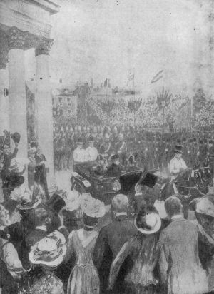 The mounted group was followed by twelve State carriages. The first was occupied by the Queen-Mother, Alexandra, and her sister the Russian Dowager Empress Marie, the Princess Royal and the Princess Victoria; the second carriage contained Queen Mary of Great Britain, Queen Maud of Norway, the Duke of Cornwall, heir to the British Throne, and the Princess Mary; the next four carriages carried Royal ladies and ladies-in-waiting; the seventh carriage contained Prince Tsai-Tao of China and his suite; the eighth carriage was shared by Special American Ambassador Theodore Roosevelt, M. Pichon, French Foreign Minister, and the representative of Persia; the ninth carriage was occupied by Lord Strathcona, High Commissioner [Pg 458]for Canada, Sir George Reid, High Commissioner for Australia and William Hall-Jones, High Commissioner for New Zealand.