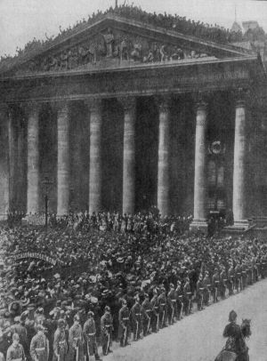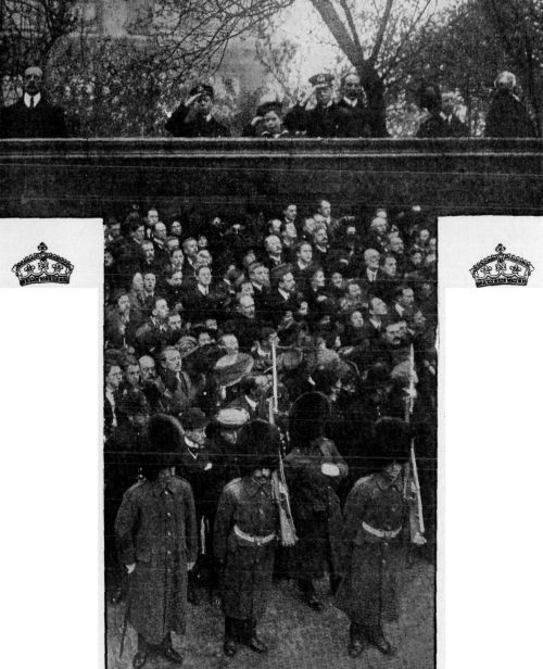 In other parts of the Empire similar scenes occurred. Throughout South Africa the most solemn memorial services were held and attended by vast congregations. There were scenes of heartfelt sorrow and hundreds of magnificent wreaths were deposited on the statue of the King at Cape Town. Funeral services were held throughout India, the Hindus joining in the services in a remarkable manner. All military trains were halted for fifteen minutes. In Australia the Governor-General and all the Ministers assembled on the great tier of steps at the Parliament Buildings, Melbourne, in the presence of perhaps the most solemn assembly ever gathered together in that country. For a long space there was a reverent silence and the crowd then sang the National Anthem. The day was observed as a day of mourning in Sydney, bells were tolled from noon to sunset, and salutes of sixty-eight minute guns fired in[Pg 460] the afternoon. A hundred thousand persons attended the memorial service in Centennial Park at Wellington, New Zealand. Services were general throughout that Dominion while every outpost of the Empire flew the Union Jack at half-mast and paid a tribute to the dead Sovereign's memory.