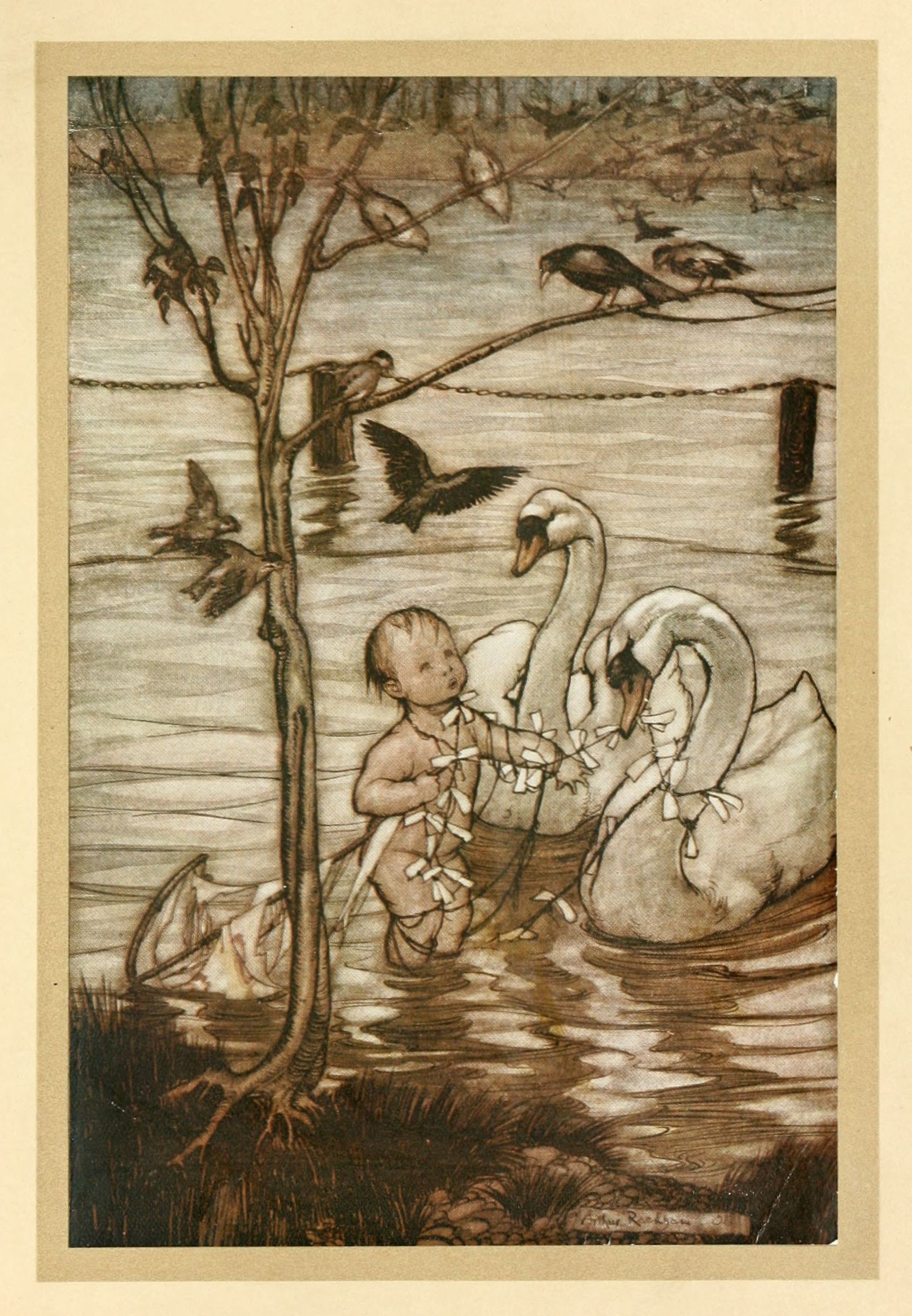At last, with a grand design burning within his brave heart, he begged them to do it once more with him clinging to the tail, and now a hundred flew off with the string, and Peter clung to the tail, meaning to drop off when he was over the Gardens. But the kite broke to pieces in the air, and he would have been drowned in the Serpentine had he not caught hold of two indignant swans and made them carry him to the island. After this the birds said that they would help him no more in his mad enterprise.