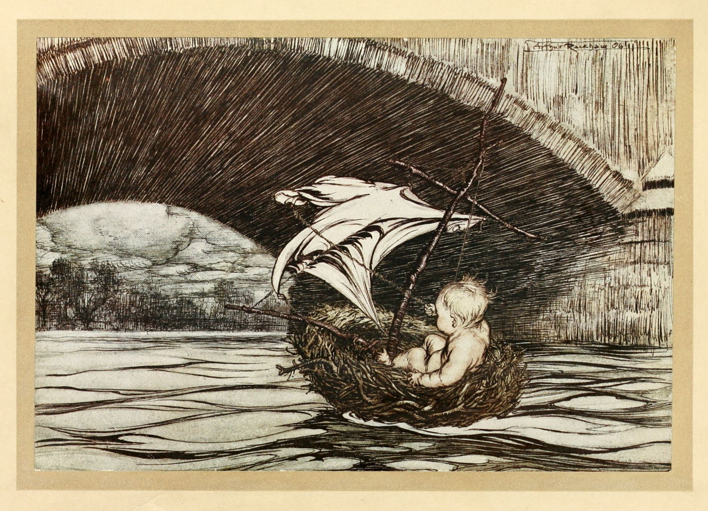 At first, his boat turned round and round, and he was driven back to the place of his starting, whereupon he shortened sail, by removing one of the sleeves, and was forthwith carried backwards by a contrary breeze, to his no small peril. He now let go the sail, with the result that he was drifted towards the far shore, where are black shadows he knew not the dangers of, but suspected them, and so once more hoisted his nightgown and went roomer of the shadows until he caught a favouring wind, which bore him westward, but at so great a speed that he was like to be broke against the bridge. Which, having avoided, he passed under the bridge and came, to his great rejoicing, within full sight of the delectable Gardens. But having tried to cast anchor, which was a stone at the end of a piece of the kite-string, he found no bottom, and was fain to hold off, seeking for moorage; and, feeling his way, he buffeted against a sunken reef that cast him overboard by the greatness of the shock, and he was near to being drowned, but clambered back into the vessel. There now arose a mighty storm, accompanied by roaring of waters, such as he had never heard the like, and he was tossed this way and that, and his hands so numbed with the cold that he could not close them. Having escaped the danger of which, he was mercifully carried into a small bay, where his boat rode at peace.