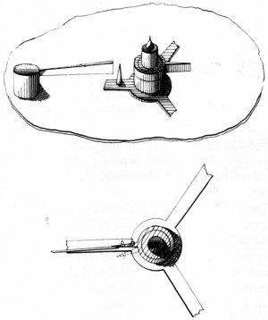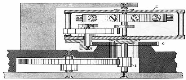 Figure 1.—Breguet’S Tourbillon. At C is shown the carriage which revolves with pinion B carrying the escapement and balance around the stationary wheel G. (After G. A. Baillie, Watches, their history, decoration, and mechanism, London, Methuen, n.d.)