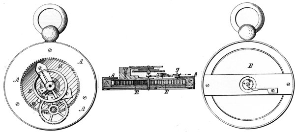 Figure 2.—Patent Drawing of the Hopkins Watch. The mainspring barrel E, of a very large diameter in proportion to the diameter of the watch, occupies nearly the full diameter of the movement. The spring itself, narrower and much longer than usual, is made in the patent model by riveting two ordinary springs together end to end. Over this barrel and attached to the stationary frame of the watch is placed a large thin ring A, cut on its inner diameter with 120 teeth. Near its edge the barrel E carries a stud g on which runs a pinion of 10 in mesh with the ring gear A. On this pinion is a wheel of 80 driving a pinion of 6 on the escape-wheel arbor. The 15-tooth escape wheel locks on a spring detent and gives impulse to the balance in one direction only, being a conventional chronometer escapement. The intermediate wheel and pinion, balance wheel, and balance cock have been adapted from a Swiss bar movement of the time.