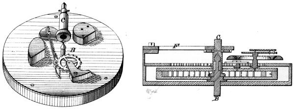 A square on arbor C at the back of the watch permits winding the main spring, which attaches to the largest diameter of C, a ratchet or winding click being supplied just under support F. The inner or front part B of the composite arbor projects from the front of the movement and revolves at the speed of the barrel arbor, which speed is not specified. Also, looking at the perspective view, we see that while the chronometer escapement has been retained, the balance has been placed eccentrically to make room for the center arbor. The balance now describes an orbit around the center of revolution. No driving train is shown, it being irrelevant to the patent, but there seems to be ample room for two intermediate wheels and their pinions between the escape wheel and the train cock boss, seen at the upper right in the perspective view of figure 4. Adding one more wheel and pinion to the train would have the effect of reducing the number of revolutions required of the spring barrel. We have seen from examination of the patent model of the Hopkins rotary that this was necessary not only to reduce the number of turns of the main spring and barrel but also to reduce the force transmitted to the escapement. There seems little reason from the foregoing observations and considerations to doubt that these modifications had been realized by the time of this patent. Again no dial gearing is shown. If the need for special gearing existed at this time it seems strange that it was not covered by patent as was done in the later patent[10] assigned to William B. Fowle. The only way to avoid special gearing would be to revolve the barrel and train each hour so that the minute hand could travel with them as it travels with the center wheel in conventional watches. Once this condition was set up, the usual dial gearing would apply.