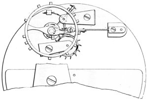 The lever escapement is the only one known to have been used, but two varieties of this are found (see fig. 11). One is a standard club-tooth lever with banking pins, the other, much more interesting because unconventional, has pointed pallets and all the lift on the escape wheel, which has very short stubby teeth, very much like the wheel of a pin-pallet escapement. No banking pins are used, the banking taking place between the pallets and the wheel. An examination of a number of these watches, with serial numbers ranging from 46 to 507,[31] reveals no correlation between the serial number and the style of escapement, from which one may conclude that the pointed pallet escapement was originally used; later four balance jewels were added and the escapement changed to the conventional club-tooth pattern. As complaints came in about the defective running of the watch these changes were apparently substituted at the factory in customers’ watches. The movements with the pointed-pallet escapement seldom show much wear; on the other hand, watch no. 224,[32] which has the conventional escapement and five jewels, is very much worn and must have run for many years.