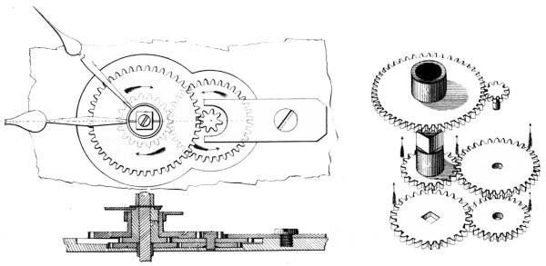 There are two great faults in the model. First is the lack of an adequate bearing for the barrel to turn on. There is only one very short bearing a long way removed from the point of engagement between 52 the pinion and internal gear, and no adequate support is given the barrel, with the result that it tends to deflect from the ideal or true position and to bind. This condition is aggravated by the fact that the ring gear was made by cutting its teeth on an angle to the axis around which it is to revolve, using only a saw of appropriate width. The teeth were then rounded-up to form by hand in a separate operation which by its very nature means that the teeth are not exactly alike. This lack of uniformity of the ring gear coupled with an entirely inadequate bearing for the barrel contributes to rather erratic transfer of power. These irregular teeth would not, of course, be a factor in factory-made watches where suitable machinery would be available for the work.