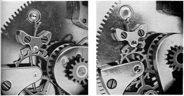 Various minor changes, dictated by experience and the need for economy in manufacture, were made in these movements. After about the first thousand the diameter of the balance was reduced from approximately .700 to about .530 inch. This smaller wheel was, of course, much more suitable to vibrate at the faster speeds required on the models beating eighths and tenths of a second. At some time between the manufacture of watches bearing serial numbers 3135 and 3622, the formerly separate winding pawl and spring were combined into one piece that could be entirely made in a punch press. Another economy move was to stamp the name and patents in place of hand engraving. For a long time hand engraving was used, although stamping had been used from the beginning on the earlier rotary watch.