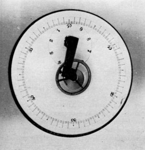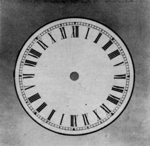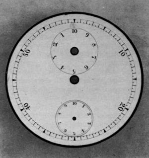 Figure 17.—A Timer Dial that is probably either experimental or very early. Note that the fractions of a second (quarters) are shown on the outside dial instead of on a separate dial. This dial was converted at the factory for use as the base of a hairspring vibrating stand. A dial different from this but having the same arrangement of circles is known. (In author’s collection.)