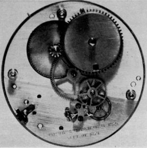 Five jewels are found in most instances, two cap jewels and two hole jewels for the balance staff and a jeweled impulse pin. One of the faults of the movement is that the cap and hole jewels on the balance are not separable for cleaning. After the jewels were inserted part of the setting was spun down over them, making the assembly permanent. A few movements with only one jewel are known, the cap and hole jewels being metal “jewels” likewise set under a spun-over rim. Whether or not the impulse jewel found in these last-mentioned movements is original or a later intrusion remains undetermined. It is easy to conceive that the factory would see no more necessity for an impulse jewel than for other jewels.