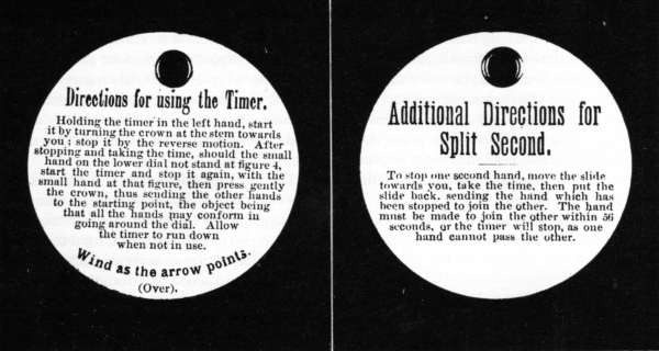 The sweep second hand and the minute register hand are attached to heart-shaped cams friction driven from their respective staffs. They are reset by a bar pivoted beneath the dial and actuated by the stem through pressure on the crown. An original instruction tag as sent from the factory with these timers is seen in figure 18.