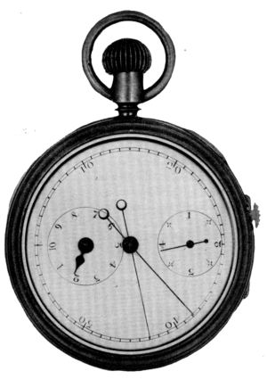 Figure 20 (left).—Auburndale Timer With Split Second Hand. Note the stop and start lever for the “split” hand at the side of the case. (In author’s collection.)