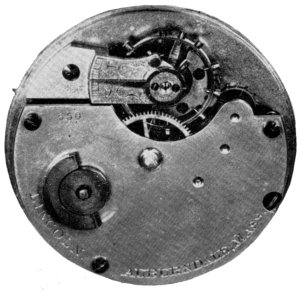 The story of Hopkins’ rotary watch now enters an entirely new setting with new financial backing which, however, had no apparent experience or background 57 in mechanical work, much less watch manufacturing. Those with watchmaking experience who were brought into this new organization unquestionably did their best, based on past experience confined to conventional watches of much higher grade. Judging from the products turned out, however, they had great difficulty in making a clean break with their past and in producing a satisfactory low-priced watch of new and radical concept. The market for watches, which had been depressed, was at this time reviving a little. The Newton Journal,[17] referring to the American Watch Co. at Waltham reported: “The hands employed in the caseroom and the machinists have been called in. All the works are to be started the first of September.”