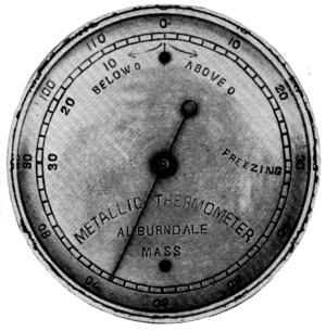 After a quantity of these Lincoln and Bentley watches had been manufactured[46] and it had become clear that they could not be attractively priced to the trade, the company sought a product adapted to their factory equipment for which a constant market could be found. The product chosen was a line of metallic thermometers.[47] Two patents, 240058 and 240059, 66 were issued to William A. Wales, assignor to the Auburndale Watch Co., of Weston, Massachusetts, on April 12, 1881. Whether these patents represent the first thermometers made at Auburndale or reflect the result of experience gained in making conventional models is not clear. The earliest evidence dating the appearance of the thermometer is the 1881 Boston directory which appeared on July 1. This illustrates the same model of thermometer seen in figure 22. The patents cover means of eliminating springs of any sort from the mechanism, so that the hand or dial pointer is entirely under the influence of the fused bimetallic thermal strips. Manufacture of the timers was carried along with thermometer manufacture at first, but production of the timer was finally dropped, as the stock on hand was constantly increasing, and for a while the factory was at last operated at a profit, on thermometers alone. These were furnished in cases from 20 inches in diameter down to the size of a ten cent piece, according to the advertising.