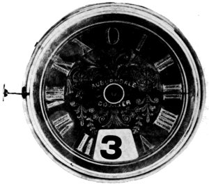 Unfortunately Mr. Fowle had suffered so much loss through the watch venture and from other investments that he was forced to make an assignment of his personal estate. The watch company, without his support, was carrying too large a burden of debt to be self-supporting. In the fall of 1883 a voluntary assignment was made and the equipment was sold in February 1884.[48] The Newton directory of 1885 lists W. B. Fowle as a thermometer manufacturer on Woodbine Street, “house near.” His home, “Tanglewood,” was on Woodbine Street and perhaps the thermometer business was operating in one of the outbuildings. William A. Wales assigned to the Auburndale Watch Co. patent 276101, of December 4, 1883, covering details of a unit counter for keeping score in games, and for similar work. Among the relics in the author’s collection is a box bearing the label “Auburndale Counter, W. B. Fowle & Son, Auburndale, Mass.” These counters were packed two in a box, the box just mentioned being suitable to contain counters the size of the thermometer in figure 22. Figure 23 shows a larger counter measuring 4-1/2 inches in diameter. From this and the fact that Fowle as late as 1887, is carried in the Newton directory as a manufacturer of metallic thermometers, it seems that some attempt was made after dissolution of the watch company to carry on manufacturing, 67 or perhaps only the assembly on a small scale of parts previously manufactured. The Directory of 1889 lists Fowle as an accountant on Ash Street, Auburndale. He had bought this property in 1887, presumably after disposing of “Tanglewood” which now would be too large for his needs. In the editions of 1891 and 1893 he is listed as United States collector of internal revenue, with an office at the Post Office building, Boston. In 1895 he appears as an accountant at the same address and from then to his death in 1902 he is listed as an accountant at his home address in Auburndale.