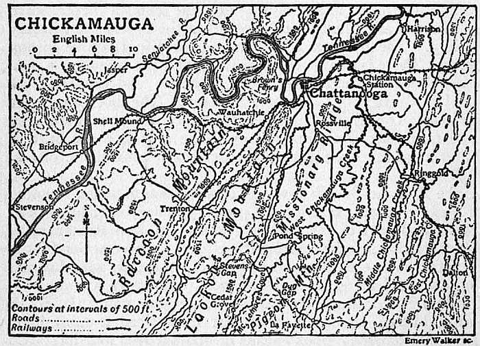 CHICKAMAUGA CREEK, a small tributary of the Tennessee river, which it joins near Chattanooga, Tennessee, U.S.A. It gives its name to the great battle of Chickamauga in the American Civil War, fought on the 19-20th of September 1863, between the Federal army of the Cumberland under Major-General W.S. Rosecrans and the Confederate army under General Braxton Bragg. For the general operations of Rosecrans’ army in 1863 see American Civil War. A successful war of manœuvre had brought the army of the Cumberland from Murfreesboro to Decherd, Tenn., and Bragg’s army lay on the Tennessee at and above Chattanooga. Rosecrans was expected by the enemy to manœuvre so as to gain touch with the Union forces in the upper Tennessee valley, but he formed an entirely different plan of operations. One part of the army demonstrated in front of Chattanooga, and the main body secretly crossed the river about Stevenson and Bridgeport (September 4th). The country was mountainous, the roads few and poor, and the Federals had to take full supplies of food, forage and ammunition with them, but Rosecrans was an able commander, his troops were in good hands, and he accepted the risks involved. These were intensified by the want of good maps, and, in the event, at one moment the army was placed in a position of great danger. A corps under A. McD. McCook moved south-eastward across the ridges to Alpine, another under Thomas marched via Trenton on McLemore’s Cove. The presence of Federal masses in Lookout Valley caused Bragg to abandon Chattanooga at once, and the object of the manœuvre was thus accomplished; but owing to the want of good maps the Union army was at the same time exposed to great danger. The head of Thomas’s column was engaged at Dug Gap, on the 11th, against the flank guard of Bragg’s army, and at the time McCook was far away to the south, and Crittenden’s corps, which had occupied Chattanooga on the 9th, was also at a distance. Thomas was isolated, but Rosecrans, like every other commander under whom he served, placed unbounded confidence in his tenacity, and if Bragg was wrong in neglecting to attack him on the 14th, subsequent events went far to disarm criticism. By the 18th of September Rosecrans had at last collected his army on Chickamauga Creek covering Chattanooga. But Bragg had now received heavy reinforcements, and lay, concentrated for battle, on the other side of the Creek.