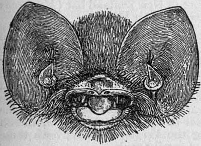 The second or typical subfamily, Vespertilioninae, includes all the remaining members of the family with the exception of the aberrant Molossinae. The upper incisors are in proximity to the canines; the premaxillae widely separated; the ears medium or large; the dental formula is i. 2/3 (or 1/3), c. 1/1, p. 3/3 (2/3, 2/2, or 1/2), m. 3/3; and the fibula very small and imperfect. All the members of this large cosmopolitan group are closely allied, and differ chiefly by external characters. They may be divided into subgroups. In the first of these, the Plecoteae, of which the long-eared bat (Plecotus auritus) is the type, the crown of the head is but slightly raised above the face-line, the upper incisors are close to the canines, and the nostrils are margined behind by grooves an the upper surface of the muzzle, or by rudimentary nose-leaves; the ears being generally very large and united. Of the six genera, Plecotus, with i. 2/3, p. 2/3, has three species:—one the long-eared European bat referred to above; P. macrotis, restricted to North America, is distinguished by the great size of the glandular prominences of the sides of the muzzle, which meet in the centre above and behind the nostrils; the third species being also American. The second, Barbastella, with i. 2/3, p. 2/2, distinguished by its dentition and by the outer margin of the ear being carried forwards above the mouth and in front of the eye, includes the European barbastelle bat, B. barbastellus, and B. darjelingensis from the Himalaya. Otonycteris, i. 1/3, pm., 1/2, connecting this group with the Vespertilioneae, is represented by O. hemprichii, from North Africa and the Himalaya, and an Arabian species. The next two genera are distinguished by the presence of a rudimentary nose-leaf: Nyctophilus, i. 1/3, p. 1/2, with three species from Australasia; and Antrozous, i. 1/2, p. 1/2, distinguished from all the other members of the subfamily by having but two lower incisors, and from other Plecoteae by the separate ears; the two species inhabit California. The sixth genus, Euderma, is also represented by a Californian species.