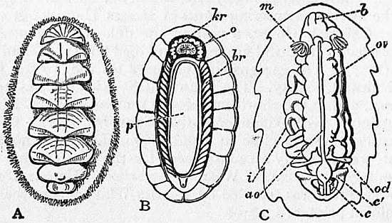 Development.—The eggs may be laid separately invested by a chitinous envelope, or as in Ischnochiton magdalenensis they may form strings containing nearly 200,000 eggs, or the ova may be retained in the pallial groove and undergo development there, as in Chiton polii and Hemiarthrum setulosum. One species Callistochiton viviparus is viviparous and its ova develop without a larval stage in the maternal oviduct. Segmentation is total and at first regular, and is followed by invagination, the blastopore passing to the position of the future mouth. By the development of a ciliated ring just in front of the mouth the embryo becomes a trochosphere. In the centre of the praeoral lobe is a tuft of cilia. Just behind the ciliated ring is a pair of larval eyes which disappear in the adult; these correspond to the cephalic eyes of Lamellibranchs. An ectodemic invagination forms a large mucous gland on the foot, which is more or less atrophied in adult life. The gonads originate by proliferation of the anterior wall of the pericardium. The shell-valves 250 arise as transverse thickenings of the dorsal cuticle behind the ciliated ring, the tegmentum being the first part formed.
