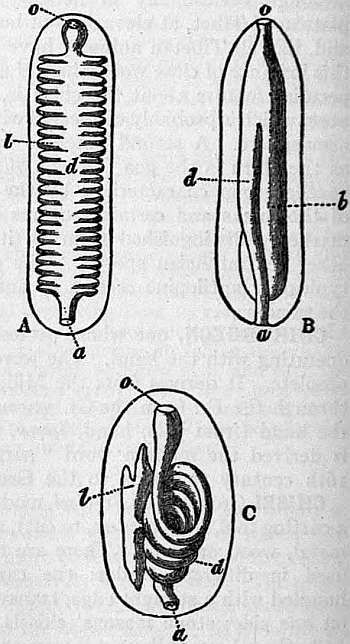 Fig. 4.—Diagrams of the alimentary canal of Amphineura (from Hubrecht). A. Neomenia and Proneomenia. B. Chaetoderma. C. Chiton. o, Mouth. a, Anus. d, Alimentary canal. l, Liver (digestive gland). |