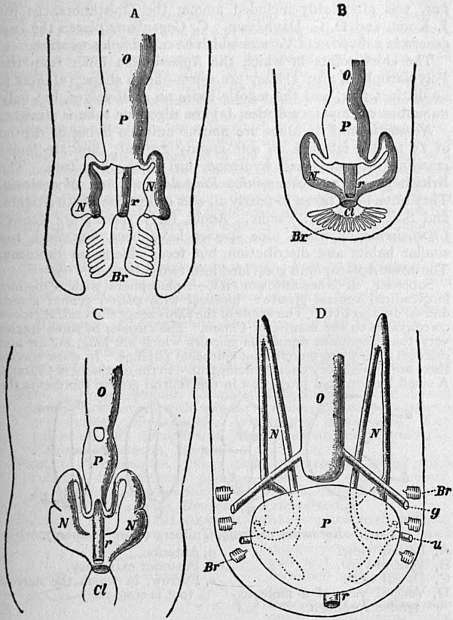 u, External aperture of nephridium. g, External aperture of the genital duct of Chiton. r, Rectum. Cl, Cloacal or pallial chamber of Neomeniae and Chaetoderma. Br, Ctenidia (branchial plumes). |