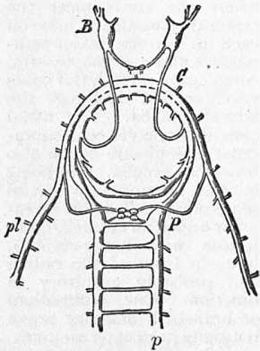 From Gegenbaur, Elements of Comp. Anatomy. Fig. 8.—Anterior part of the nervous system of Chiton cinereus, in more detail. B, Buccal ganglia (concerned with the odontophore). C, Cerebral nerve-mass. P, Pedal ganglion and commencement of pedal nerve-cord. pl, Visceral nerve-cord. The sublingual ganglia are not lettered. |
