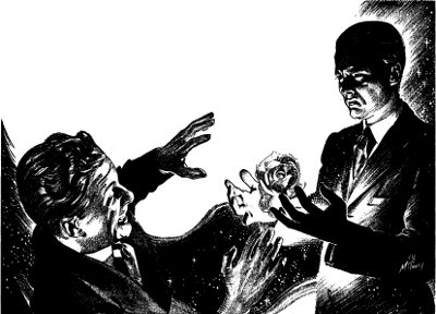 Reggie set his drink down hastily. For a long deliberate moment he studied the back of the dark little man at the bar. Then he shook his head dazedly. Maybe this was all some wild product of his imagination. Maybe he was having hallucinations....