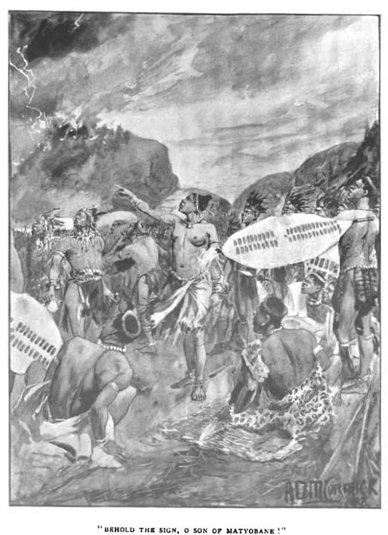 She had half turned, and with one hand was pointing towards the ascending smoke-cloud towering above the hill of death. A sharp, crashing peal of thunder shook the world, and the lightning-gleam seemed to flash down right upon the smouldering pile. A silence was upon all as, with upturned faces, King, izinduna, guards, slayers, the whole multitude sat motionless, waiting for what should next befall. Not long had we to wait.