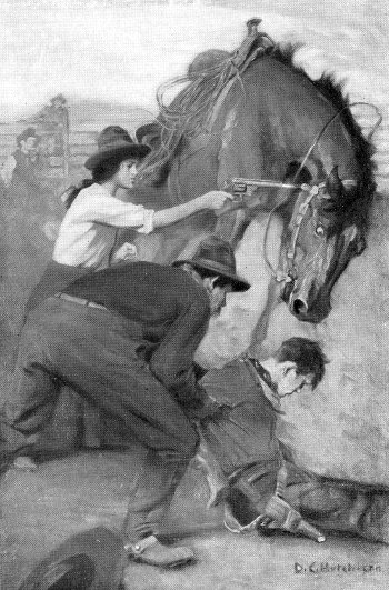 And Bowles scrambled up and fell over to one side. His knees were weak; they would not bear him; and through the dust cloud he saw Dunbar slide and turn again. Then of a sudden he was in a tangle of legs and stirrups and striking feet, and somebody grabbed him by the arm. Three pistol shots rang out above him; he was snaked violently aside; and old Dunbar went down like a log. Somebody had killed him, that was certain; but it was not Brigham, for he could tell by the characteristic cursing that it was his partner who had pulled him out and was dragging him across the corral. He blinked and opened his eyes as he fetched up against the fence—and there was Dixie Lee, with a big, smoking pistol in her hand, striding after him out of the dust.