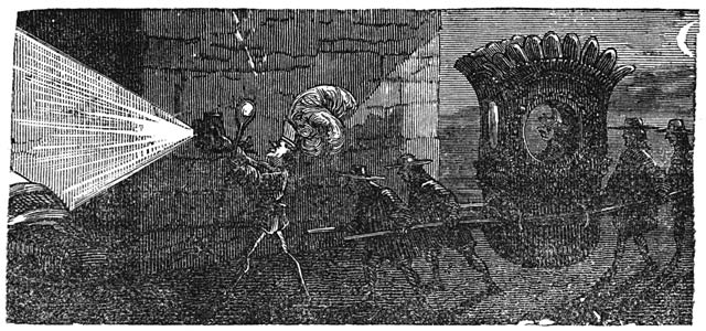 Omstreeks vier uur nadat wij onze reis begonnen waren, werd ik wakker door een heel belachelijke gebeurtenis; terwijl het rijtuig nl. even stilhield, omdat er iets aan in orde moest gebracht worden, hadden twee of drie van de jonge inboorlingen de [17]nieuwsgierigheid te willen zien hoe ik eruit zag als ik sliep; zij klommen daartoe op het voertuig, en toen ze heel zoetjes tot bij mijn gezicht waren gekomen, stak een van hen, een officier van de garde, het scherpe eind van zijn handspeer een goed end in mijn linker neusgat, wat mij een gevoel gaf of er met een strootje in mijn neus gekriebeld werd, en me heel erg aan ’t niezen maakte; toen kropen zij onbemerkt weg, en het duurde drie weken, eer ik wist hoe het kwam, dat ik zoo in eens wakker geworden was. Het overige deel van dien dag maakten wij een langen marsch en hielden ’s nachts stil, met vijfhonderd man keurbenden aan weerszijden van mij, de eene helft met toortsen en de andere met bogen en pijlen, gereed om mij dood te schieten als ik mij bewegen dorst. Den volgenden dag, met zonsopgang, zetten wij onzen tocht voort, en kwamen omstreeks den middag tot op twee honderd el afstand van de stadspoorten. De Keizer en zijn heele hof kwamen naar buiten om ons te ontmoeten, maar zijn hoofdofficieren wilden in geen geval toestaan, dat Zijne Majesteit zijn persoon in gevaar zou brengen door op mijn lichaam te klimmen.