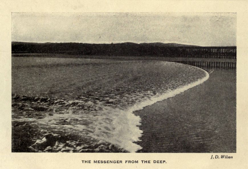 But never to-night or in all time would he get as far as the bank. Suddenly, as he walked, he would hear a whisper out of the west. It would mean nothing to him at first, nor the wind feeling along his cheek. He would only say to himself that the trees were astir on the far point. Then he would hear a noise like a coming shower, and lift up his face to meet the first of the rain. But the sound that came after would come running along the sand, until every rib was vibrating its message to his feet. When he knew what it was, he would stand perfectly still, and then he would spring in the air and start to run. But, run as he might, he would never reach the shore, or stand on the gold road that would take him over to May. The white tide-horses were swifter far than he; their unshod hoofs would outrun his heavy boots. The sweeping advance-water would suddenly hem him in, swirling before his feet and shooting behind his back. He would run this way and that in the dark, but it would be no use. He would run and run, but it would never be any use....