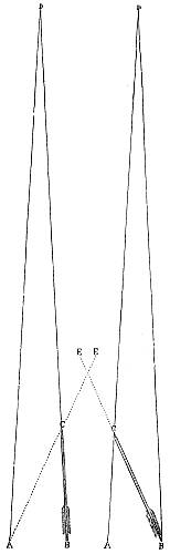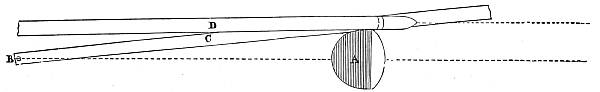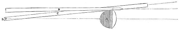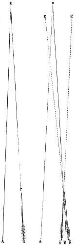 Mr. R. Hely-Hutchinson, already mentioned as having made experiments in modern times with steel bows, had another peculiarity. On the back of his bow he had a flat piece of hard wood or metal fixed at right angles to the length of his bow. An upright piece of the same material was fitted into a groove in this, whose outside distance was about an inch from the place where the arrow usually touches the bow above the handle. He used always to shoot with his arrow resting, not on the bow, or on his hand, but in the outside angle between this projection and the upright piece of it. He aimed as other archers do, and has been seen to make excellent hitting at the distance of one hundred yards, even when far advanced in years. In this case the axis of the arrow, or the line of aim, was distant from the plane through the string and the axis of the bow an inch in addition to the usual half-width of the arrow and half-width of the bow. Yet the arrow appeared to fly quite steadily and truly. It is not known why he adopted this peculiarity, and it is unnecessary[42] to inquire; but it will serve as a useful peg whereon to hang a further consideration of the difficulties an arrow has to contend with in getting straight to the point of aim, and its determined resolution to overcome these difficulties. In addition to the forces already discussed as acting upon the arrow, there is also the force of gravity, the resistance of the air, and the interference of the wind; but these forces affect in the same way all arrows, however shot. The same may be said of all the other forces implicated, until there is an artificially increased impediment interposed in addition to the natural one of the half-bow and half-arrow. Now, supposing the distance of the nock from the centre of the bow be such when the arrow is drawn that a perpendicular let fall from the centre of the bow to the line of aim will mark off twenty-seven inches of draw, the resolution of the force acting in the line from the nock to the centre of the bow will be correctly represented by twenty-seven in the direction of the point of aim and three-eighths at right angles to that direction; or the relation between the straight part of the whole force and its remainder will be as 216 to 5.