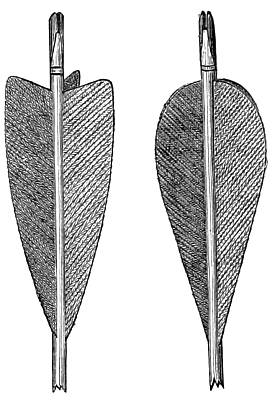 [37] The feathers are preserved from damp by a coat of oil paint laid on between them and for one-eighth of an inch above and below them. This should afterwards be varnished, and the rib of the feather should be carefully covered, but care must be taken to avoid injuring the suppleness of the feather with the varnish. Feathers laid down or ruffled by wet may be restored by spinning the arrow before a warm fire carefully.