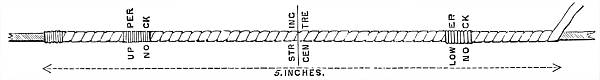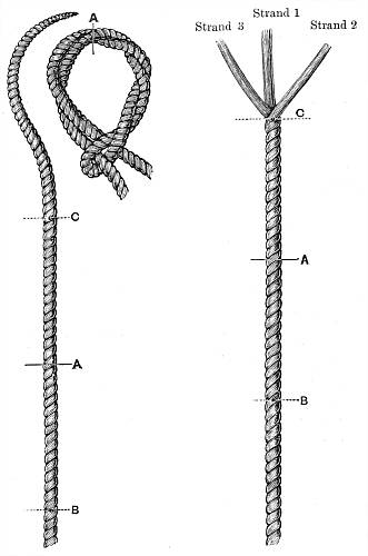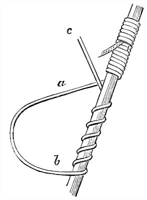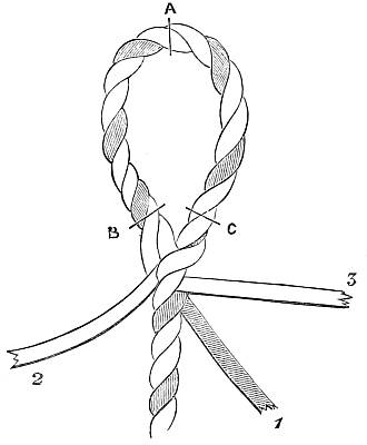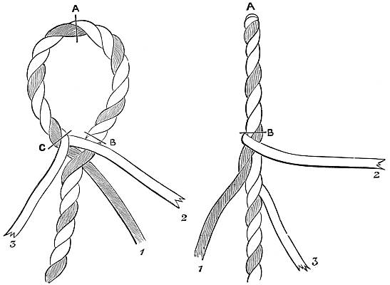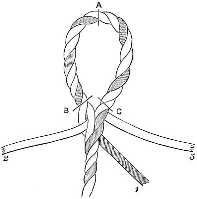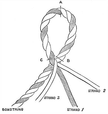 In the choice of a string see that it has three, not two, strands; and care must be taken to avoid those that are too hard and stiff, as they are liable to be brittle and to break very soon. The next thing to be attended to is that the string is smooth and round throughout, and sufficiently increased in bulk at the ends where are the eye and loop. It cannot be doubted that a quicker cast may be obtained from a thin string than from a very thick one; but it will be better to choose strings strong enough in proportion to the strength of the bows to ensure their (i.e. the bows') safety rather than to pay too much regard to this quickness of cast. When the string is chosen its eye must be fitted into the groove of the lower horn of the bow. In order to make the loop at the other end the string must now be applied to the back of the unbent bow,[45] and the first rounded turn of the loop must be made at about three inches from the groove of the upper horn, or two and a half inches in the case of a lady's bow. At about the distance of one inch and a quarter beyond—and one inch in the case of a lady's string—the crown of this rounded turn the string must be sharply bent back, and this sharp bend applied round the string on the other side of the rounded turn. Slip the sharp turn a little further down the string towards the eye, and twist the remaining reversed end of the string three times round the looped part of the string, beginning inwards. The sharp turn must then be pushed back into the first bent position. The eye must now be passed over the upper horn, and passed far enough down the bow to allow the loop to be passed over the lower horn and into its groove, and the loop should be so applied into this groove that the waste end of string shall lie between the sharp turn and the horn (see fig. 16). If the waste end of the string be then knotted firmly, and the remainder cut off, the loop will be finished, and, if successfully managed, will never shift or stretch when it has once reached its bearings. The virtue in this loop is that it is quite fast and tight when in use, and yet it can be very readily slipped off and opened for readjustment on the same bow, or for application to another bow of different length. By far the neatest finish to a bowstring is the addition of a second eye instead of the loop, and this is now very readily done by the bowmakers for their customers at a small additional charge; but every handy archer should learn how to make this second eye for himself. The following method is recommended. When the loop has been correctly adjusted, so that the string, when the bow is braced, is at a suitable distance from the bow (i.e. six inches or so for a man's bow, or five and a half inches for a lady's bow) mark with ink the crown of the rounded turn before mentioned (i.e. the point of the string, not of the waste twisted round the string in the loop nearest to the upper horn). Now unbrace the bow and take off the string. Undo the loop and straighten[46] out the string (see fig. 15). At the distance of one inch and a quarter (one inch is sufficient for a lady's string) from the ink-mark, and on each side of it, tie tight round the string a small piece of fine waxed thread; cut off the waste end of the string at the knot made in finishing the loop. Keep the part of the string between the two ties well wound up during the whole of the succeeding stages of the manufacture of this[47] part into an eye so as to correct the necessary unwindings. Unwind up to C, fig. 17, completely separate, and straighten out the three strands (1), (2), (3), fig. 17, of the remaining portion of the waste end of the string up to its tie at C. Pass a small marlinespike or stiletto between each of the three strands of the string, just beyond the other tie at B, and as close to it as possible. Flatten out the three unwound strands of the waste end fingerwise (fig. 17). Bend (keeping it wound up) the part of the string between the two ties B and C, so as to bring these two ties exactly together, with the separated strands (1), (2), (3) lying across the string at right angles to its worm (see fig. 18). Now insert the middle strand (1), fig. 19 (taking care to cross the worm of the string), with the help of the marlinespike under that strand of the string across which it lay in fig. 18.