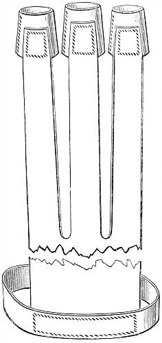 The pile, or point, is an important part of the arrow. Of the different shapes that have been used, the best for target-shooting—now almost the only survivor—is the square-shouldered parallel pile. Its greatest advantage is, that if the arrow be overdrawn so that the pile be brought on to the bow, the aim will not be injured, as must be the case with all conical piles so drawn. (Very light flight-arrows, for which the piles provided for ladies are considered too heavy, must still be furnished with the conical piles used for children's arrows.) This parallel pile is mostly made in two pieces—a pointed cone for its point, which is soldered on to the cylindrical part, which itself is made of a flat piece of metal soldered into this form. This same-shaped pile has occasionally been made turned out of solid metal; but this pile is liable to be so heavy as to be unsuitable for any but the heaviest arrows, and the fletchers aver that it is difficult to fix it on firmly owing to the grease used in its manufacture. Great care should be taken, in the manufacture of arrows, that the footing exactly fits the pile,[38] so as to fill entirely the inside of it; unless the footing of the arrow reach the bottom of the pile, the pile will either crumple up or be driven down the stele when the pile comes in contact with a hard substance. It is, of course, fixed on with glue; and to prevent its coming off from damp, a blow, or the adhesiveness of stiff clay, it is well to indent it on each side with a sharp hard-pointed punch fitted for the purpose with a groove, in which the arrow is placed whilst the necessary pressure is applied. This instrument may be procured of Hill & Son, cutlers, 4 Haymarket.