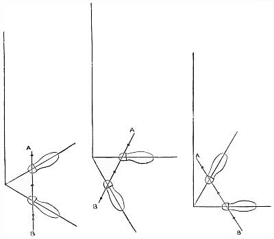 The recoil of the bow, besides the motion in the direction of aim, impresses a rotary motion upon the arrow about its centre of gravity. This tendency to rotate, however, about an axis through its centre of gravity is counteracted by the feathers. For, suppose the arrow to be shot off with a slight rotary motion about a vertical axis, in a short time its point will deviate to the left of the plane of projection, and the centre of gravity will be the only point which continues in that plane. The feathers of the arrow will now be turned to the right of the same plane, and, through the velocity of the arrow, will cause a considerable resistance of the air against them. This resistance will twist the arrow until its point comes to the right of the plane of projection, when it will begin to turn the arrow the contrary way. Thus, through the agency of the feathers, the deviation of the point of the arrow from[32] the plane of projection is confined within very narrow limits. Any rotation of the arrow about a horizontal axis will be counteracted in the same way by the action of the feathers. Both these tendencies may be distinctly observed in the actual[33] initial motion of the arrow. In the discussion of these rotations of the arrow about vertical and horizontal axes the bow is supposed to be held in a vertical position.